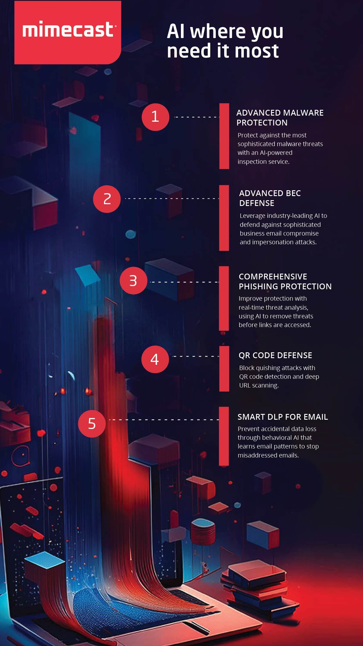 To help, Mimecast has developed this quick and concise infographic to showcase the areas in which AI can provide real security against sophisticated cyberattacks.
